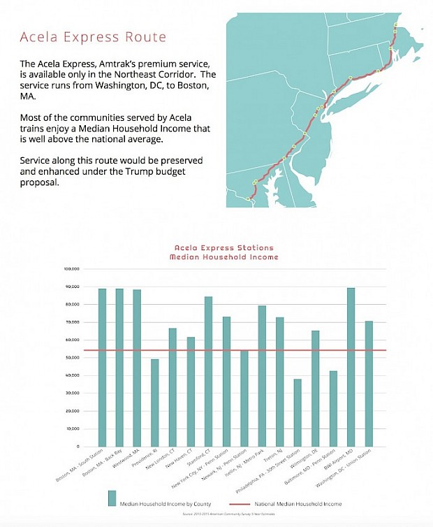 The Northeast Corridor is, without question, an outstanding market for Amtrak and other forms of public transportation. It is important to note that, with just 2% of the U.S. land area and 17% of the nation’s population, half of the wealthiest counties in America are located in the NEC region. It’s also important to acknowledge that when we talk about eliminating corridors on the National Network—and the associated economic opportunities that come with access to interstate train service—we’re talking about eliminating service for less affluent and less well-educated communities. When we say a single mother in Walnut Ridge, Arkansas deserves access to the same fundamental services as a banker on Wall Street, we’re not making an economic assertion—we’re making a statement about our country’s core values.